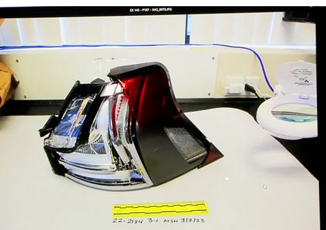 Maureen shows the taillight housing to the jury, and it’s noted that she sees several more small plastic pieces in the evidence bag, which broke off likely due to the storing/handling of evidence between trials.