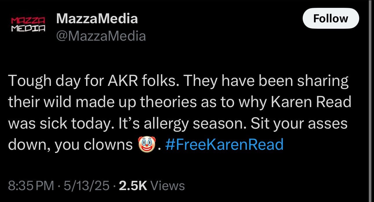 AKR (Anti-Karen Read) is the acronym her fans use to refer to anyone who thinks the drunk driver defendant is guilty of driving recklessly into her boyfriend. Mark asserts that the murder trial was paused due to seasonal allergies as if that’s the most logical explanation that everyone should have made.