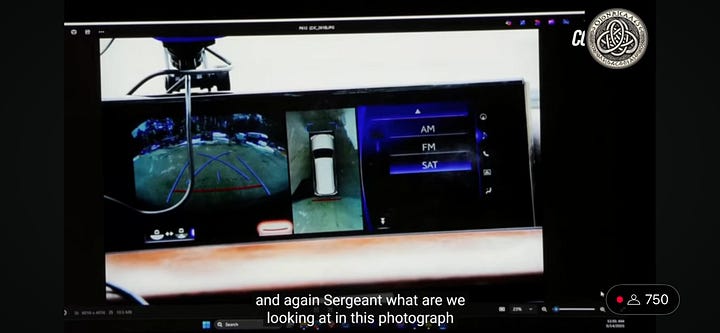Sgt. Clark was called to document the inside and outside of Karen’s SUV on 2/1/22. Photos of the dashboard odometer, and backup camera are shown to the court.