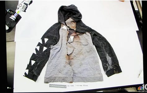 Maureen also examined the victim’s clothing. She swabbed the areas of the sweatshirt where John’s injuries were located. She removed and scraped debris from the clothing, tested the shirt for blood detection (positive), and described the dirt and blood stains found on the items.