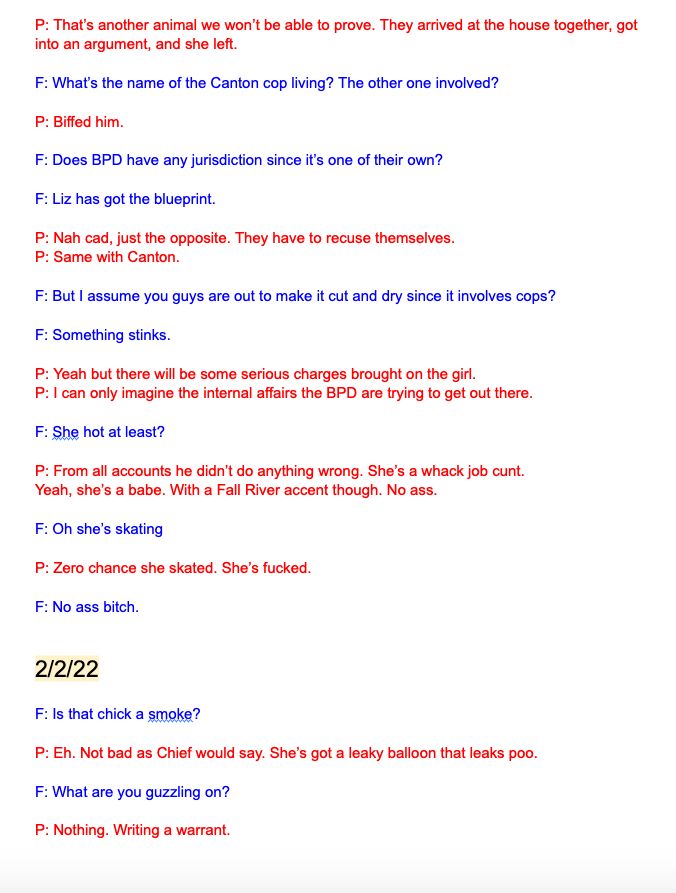 Diamandis did not actually engage in this particular text conversation that he was on the stand to authenticate, and he felt uncomfortable reading the derogatory words said in the thread aloud. Instead, Prosecutor Brennan read the harsh ones to the court while Diamandis confirmed them.
