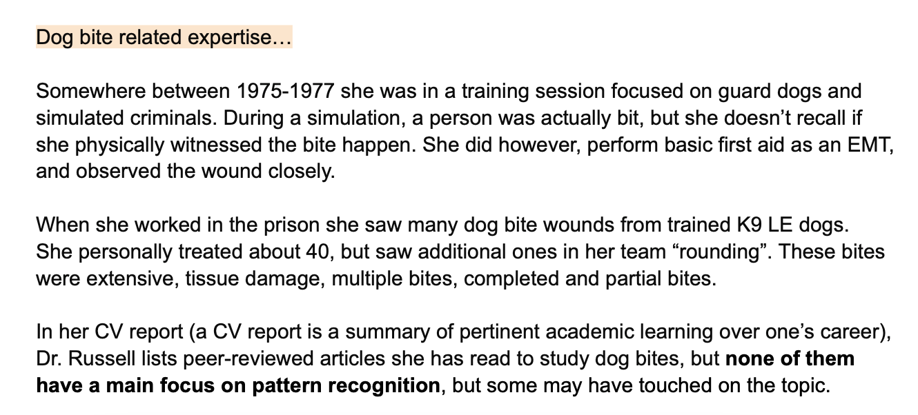 Dr. Russell has testified as a medical expert witness in other trials, but has never testified as a ‘dog bite expert’ before this trial.