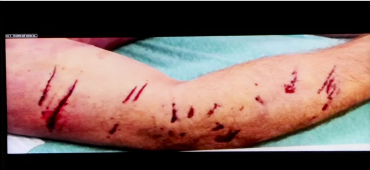 John’s wounds are mild abrasions, which means the top layer of the skin (epidermis) was injured, but there are zero lacerations or puncture wounds. Despite this, Dr. Russell believes that John’s wounds are consistent with a dog attack and that the dog just never latched on.