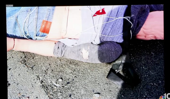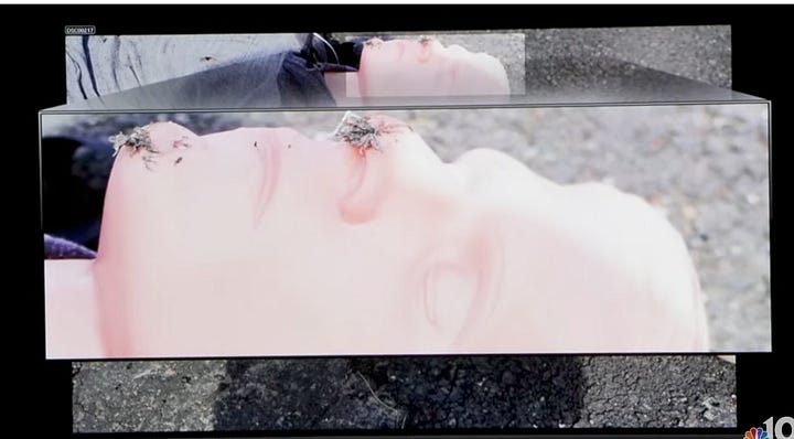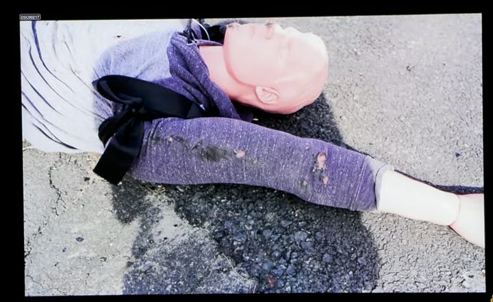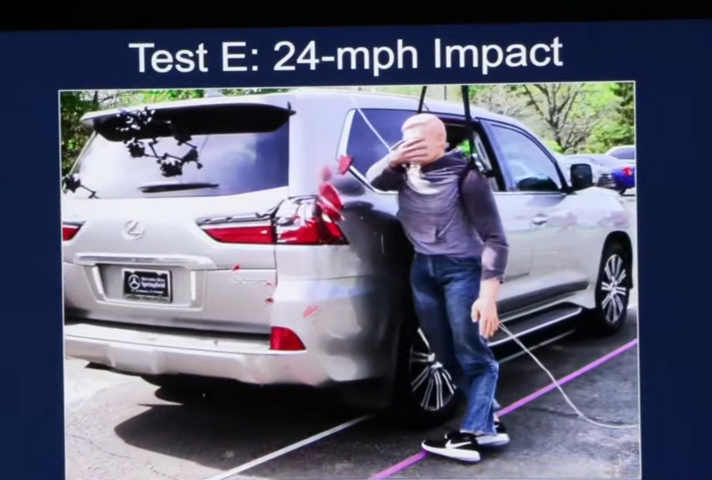 Defense Attorney Jackson puts photos up on the projector and asks Wolfe what defects he sees on the dummy doll that was hit by a reverse speed of 29 mph. Wolfe points out: