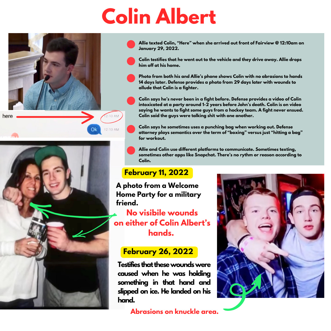Photos of Colin proving he had no injured knuckles about a week and a half after the crime was admitted into evidence for Karen Read’s trial. An injured knuckle photo taken about a month after John died has been used online to allege Colin was involved in John’s death. Colin testifies that he slipped on ice while holding an object (he believes his phone) and didn’t want to drop it. He fell forward and skimmed his hand from the fall. That injury is a moot issue since there is earlier proof it didn’t occur the night of John’s death.